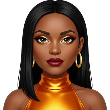 Rozonda Chilli Thomas from TLC with dark brown eyes, long black straight hair, gold eyeshadow, dark red lipstick, yellow-orange metallic high neck dress, gold earrings emoji