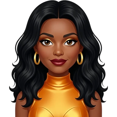 Rozonda Chilli Thomas from TLC with dark brown eyes, long black hair, gold eyeshadow, dark red lipstick, yellow-orange metallic mermaid crop top, silver necklace and earrings emoji