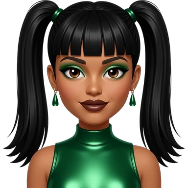 Lisa Left Eye Lopes from TLC with medium dark skin, dark brown eyes, black 1990s straight two high ponytail bang hair, green eyeshadow, dark brown lipstick, green metallic high neck dress, earrings emoji