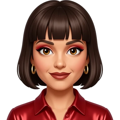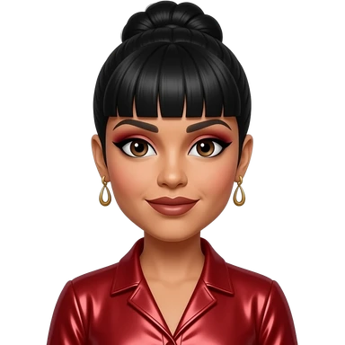 Lisa Left Eye Lopes from TLC with dark brown eyes, black bang hair with updo, red eyeshadow, brown lipstick, red metallic blouse, earrings emoji