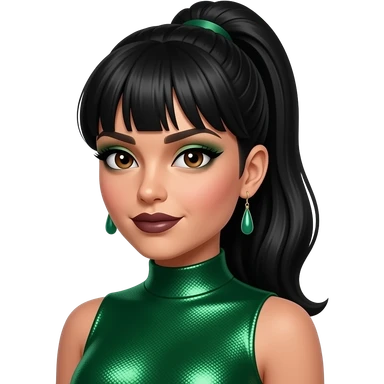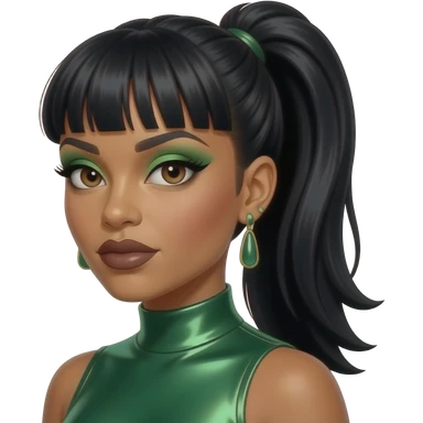 Lisa Left Eye Lopes from TLC with dark brown eyes, black 1990s high ponytail bang hair, green eyeshadow, dark brown lipstick, green metallic high neck dress, earrings emoji