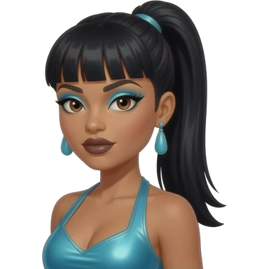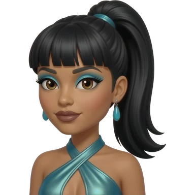 Lisa Left Eye Lopes from TLC with dark brown eyes, black straight three ponytail hair with bang, cyan eyeshadow, dark brown lipstick, cyan metallic halter dress, earrings emoji