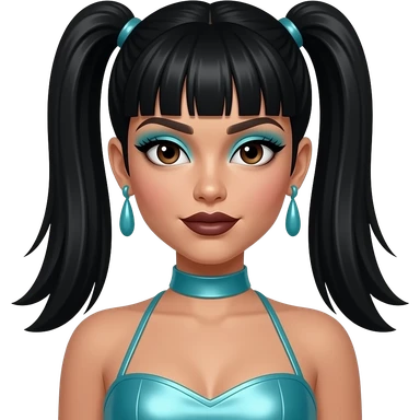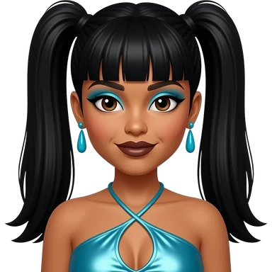 Lisa Left Eye Lopes from TLC with dark brown eyes, black straight two ponytail hair with bang, cyan eyeshadow, dark brown lipstick, cyan metallic halter dress, earrings emoji