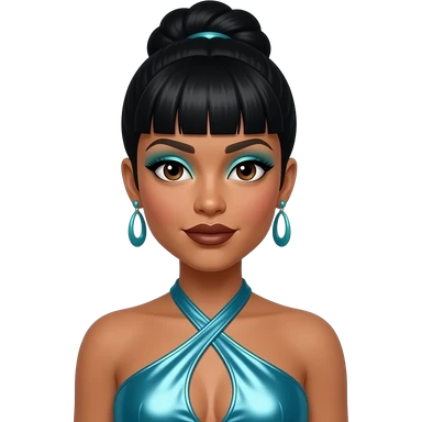 Lisa Left Eye Lopes from TLC with dark brown eyes, black 90s high ponytail and updo hair with bang, cyan eyeshadow, dark brown lipstick, cyan metallic halter dress, cyan earrings emoji