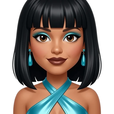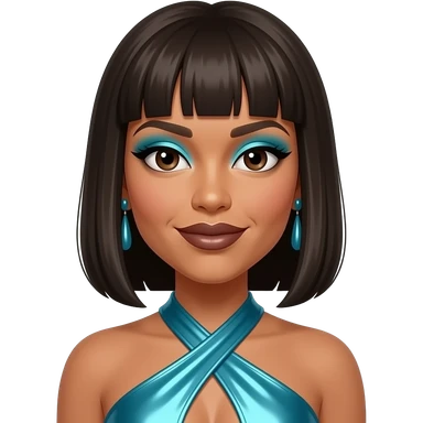 Lisa Left Eye Lopes from TLC with dark brown eyes, black 90s straight medium hair with bang, cyan eyeshadow, dark brown lipstick, cyan metallic halter dress, cyan earrings emoji