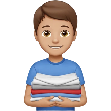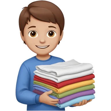 Little boy with brown hair smiling and carrying a stack of clean folded clothes emoji | AI Emoji Generator