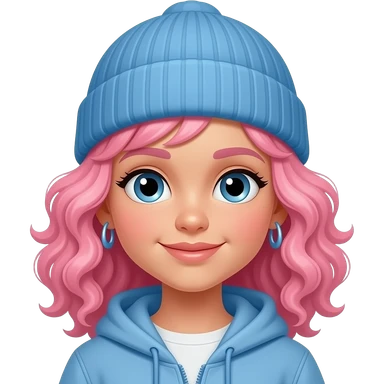 little girl with curly pink hair and blue beanie and earrings emoji