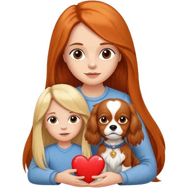 Little girl with a long fair hair with mom and cavalier king charles spaniel and heart emoji