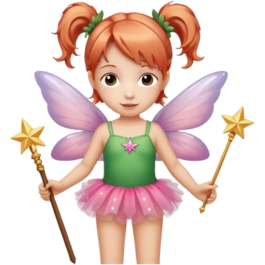 Little girl with fairy wings, wand, and tutu. She has strawberry blond hair with pig tails. emoji