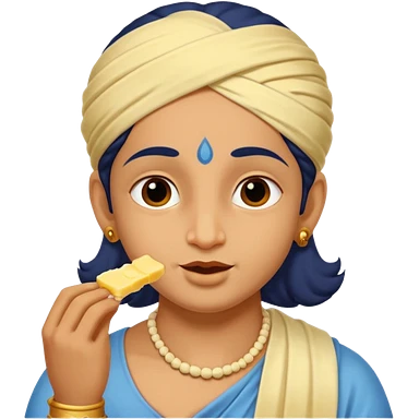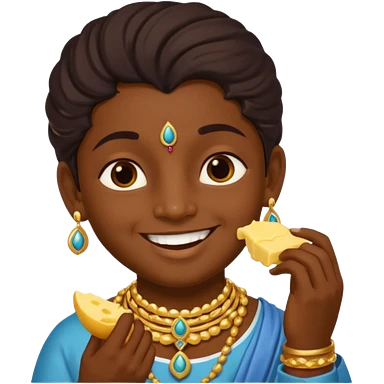 Kid Krishna, smiling, sitting with butter pot, blue skin emoji