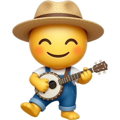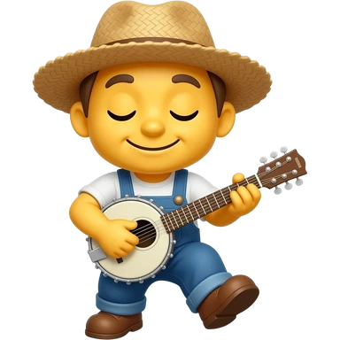 Little mini yellow emoji smiling, mouth closed, wearing straw hat playing banjo stomping his foot, top view, wearing coveralls, eyes closed emoji | AI Emoji Generator