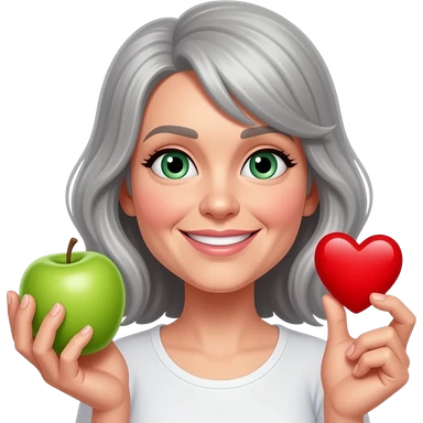 Lady around 45 with Green eyes beautiful grey hair and with Green apple and sending red heart emoji