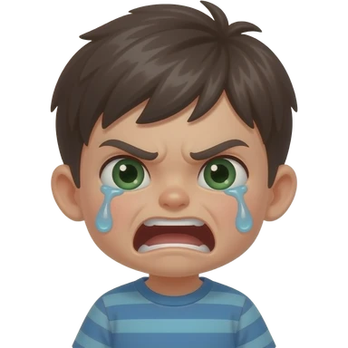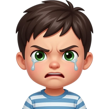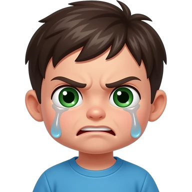 Little slim dark haïr boy with green eyes fleshes with very angry face, crying emoji