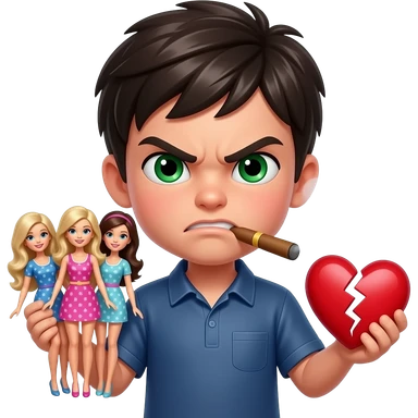 Little slim dark haïr boy with green eyes with three barbies in one Hand with very angry face and cigar and broken heart in another hand emoji
