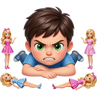 Little slim dark haïr boy with green eyes lying very angry on the floor and barbies emoji