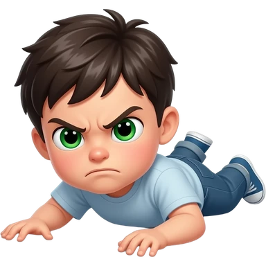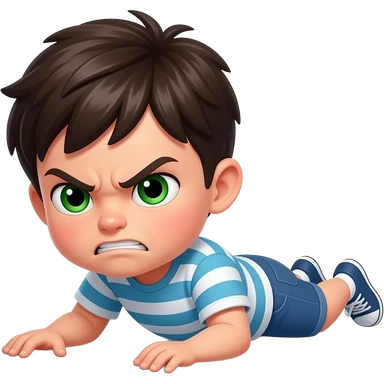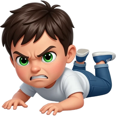 Little slim dark haïr boy with green eyes lying very very angry on the floor emoji