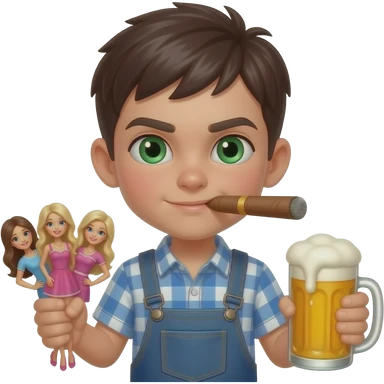 Little slim dark haïr boy with green eyes very arrogant with a cigar, there barbies in one hand and a beer in another emoji