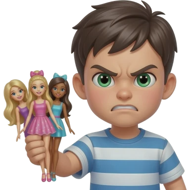 Little slim dark haïr boy with green eyes with three barbies in one Hand with very angry face emoji