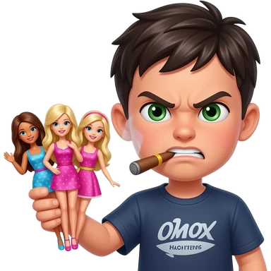 Little slim dark haïr boy with green eyes with three barbies in one Hand with very angry face and cigar emoji