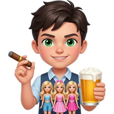 Little slim dark haïr boy with green eyes very arrogant Andry face, with a cigar, three barbies in one hand and a beer in another emoji