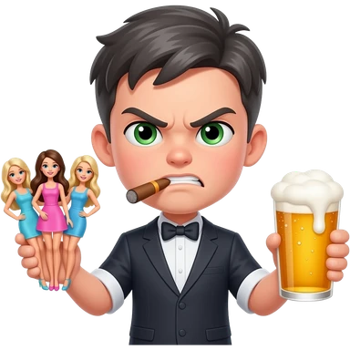 Little slim dark and grey hair boy with green eyes very arrogant Angry face, with a cigar, three barbies in one hand and a beer in another emoji