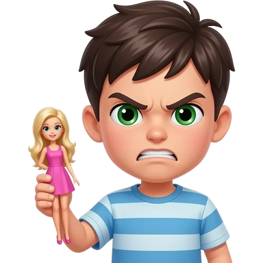 Little slim dark haïr boy with green eyes with broken barby doll in one Hand with very angry fac emoji