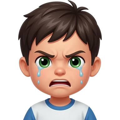 Little slim dark haïr boy with dark green eyes with has h with very angry face, crying emoji