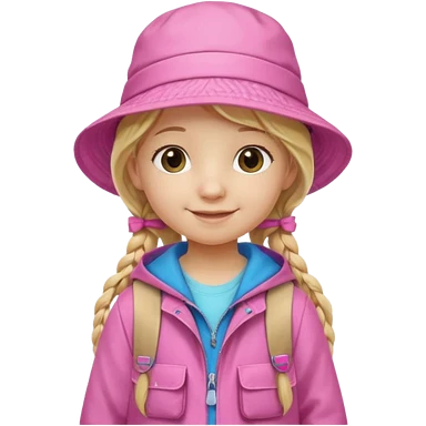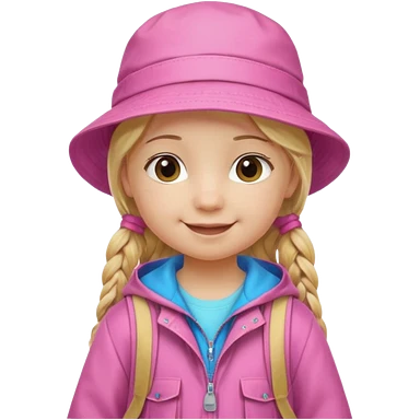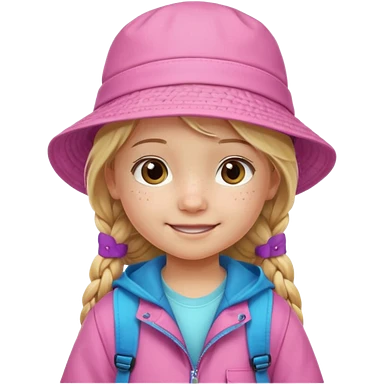 Little student, long braid blonde, wears pink bucket hat and jacket, backpack, happy emoji