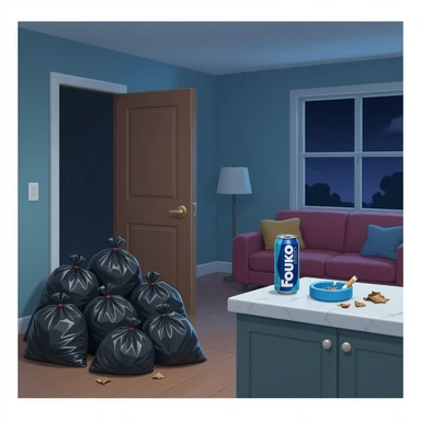 trash piled up everywhere: garbage bags near the front door, cans of Four Loko energy drinks and full ashtrays in the living room, dried-out contact lenses stuck to the kitchen counter. emoji