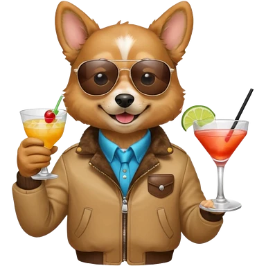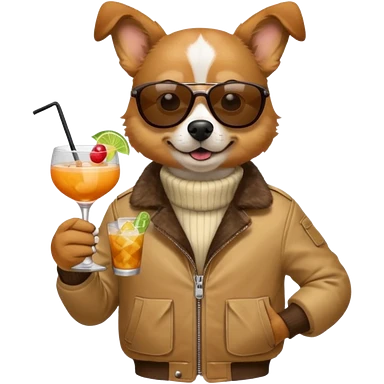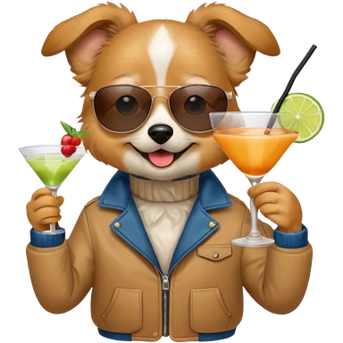 Dog with jacket, holding a cocktail, wearing sunglasses emoji