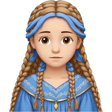 Joven de unos 20 años, de aspecto dulce y elegante. Piel clara, ojosy expresivos, sonrisa triste. Rubio o castaño claro, largo, con trenzas o velo. -Vestido largo de tonos suaves (blanco, azul o lavanda), con bordados dorados; un manto o toca fina cubriendo la cabeza. emoji