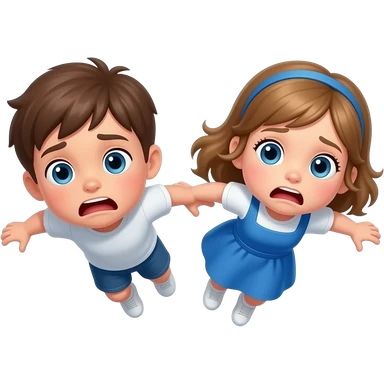 chico y chica caiendo del cielo asustados, el chico castanyo i con pelo corto y la chica pelo suelto y un poco rubia pero castaño y los dos tienen ojos azules son hermanos la chica con la ropa blanca i vestido azul caiendo de un agujero negro emoji
