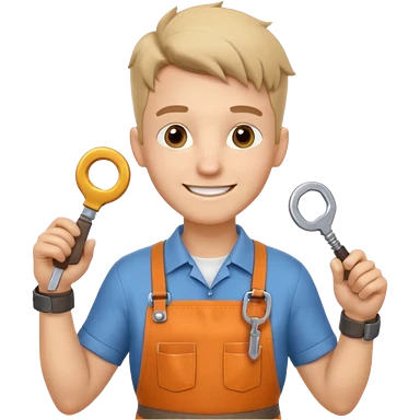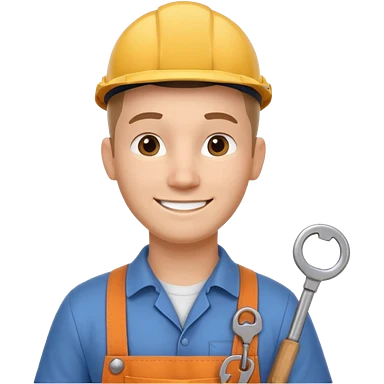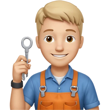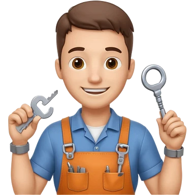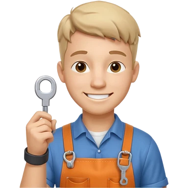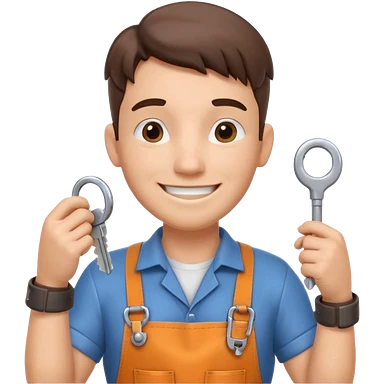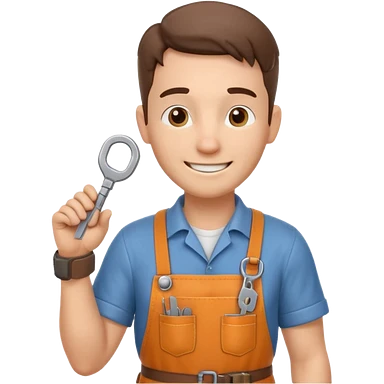 locksmith portrait, head and shoulders only, wearing work apron collar, holding a key near face, friendly confident smile, tool belt strap visible, 3D cartoon, mobile game icon style, clean background, no text, no watermark emoji