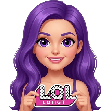 sexy girl with long purple hair and purple eyes holding a LOL sign emoji