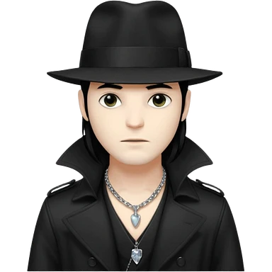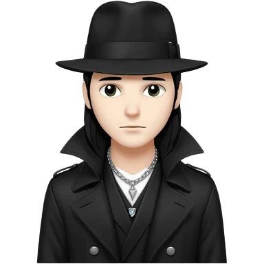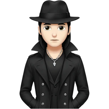 Male Goth with Fedora Sleek long hair, white skin, black trench coat, silver necklace visible under coat emoji