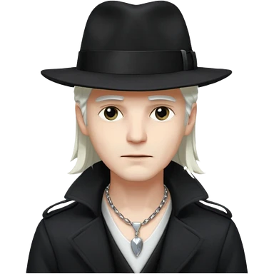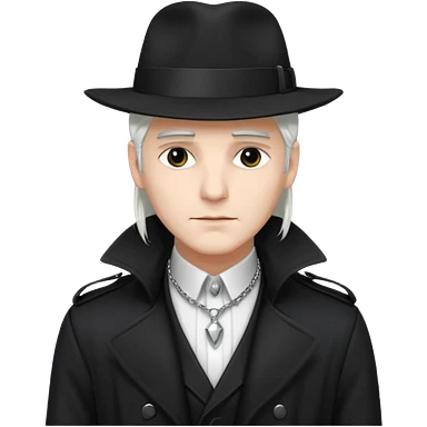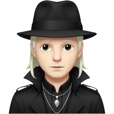 Male Goth with Fedora Sleek long hair, white skin, black trench coat, silver necklace visible under coat, white long hair emoji