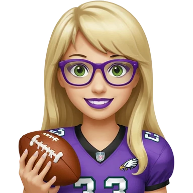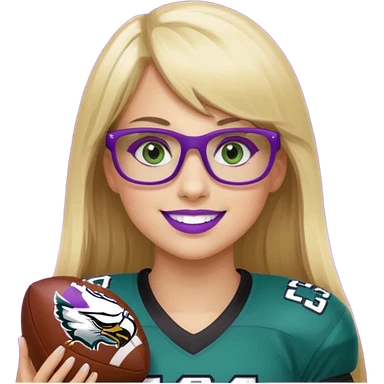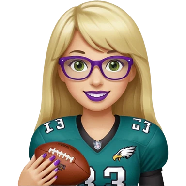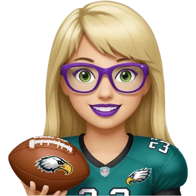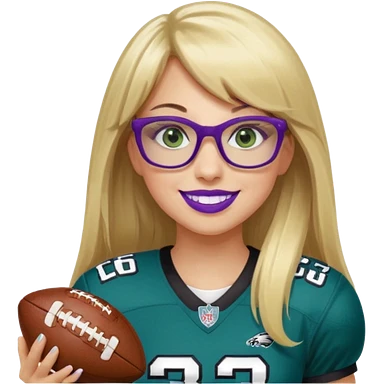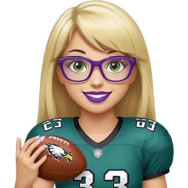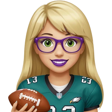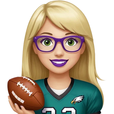 long blonde hair with bangs black rectangle glasses female green eyes football player wearing eagles uniform jersey number 33 holding football smiling purple lipstick emoji