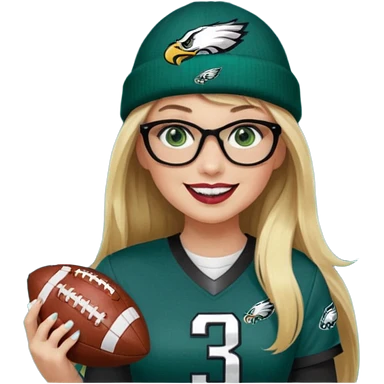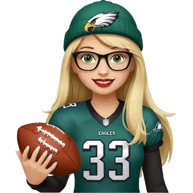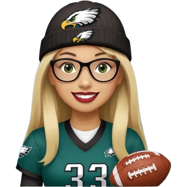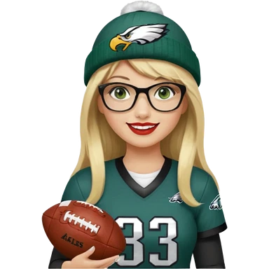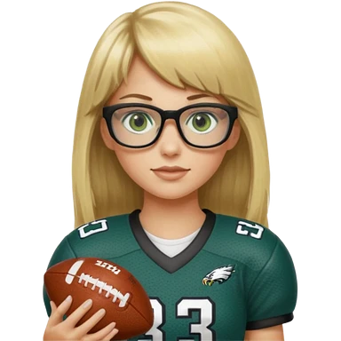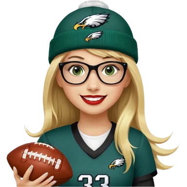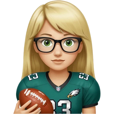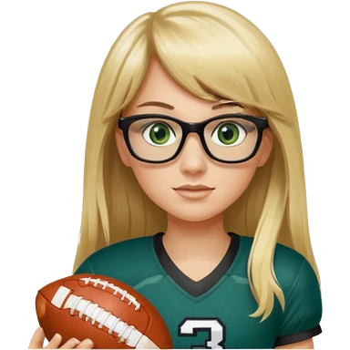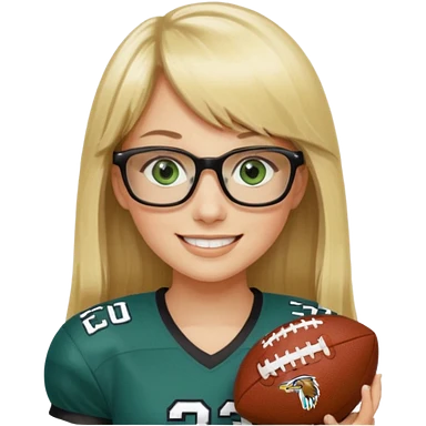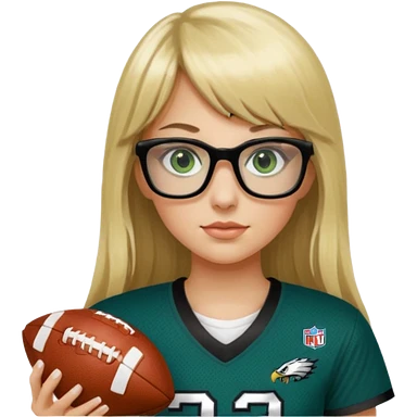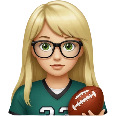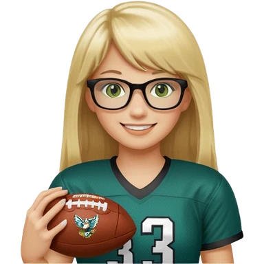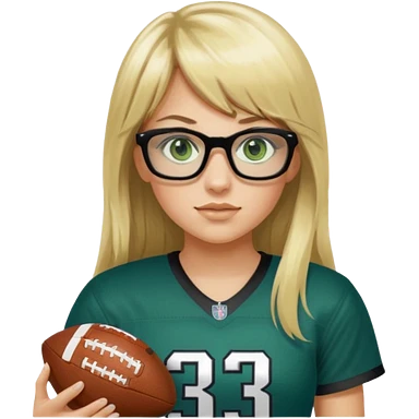long blonde hair with bangs black rectangle glasses female green eyes football player wearing eagles jersey number 33 holding football emoji