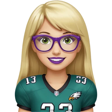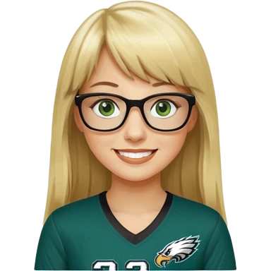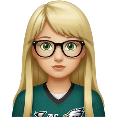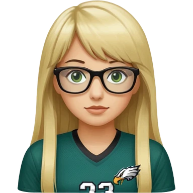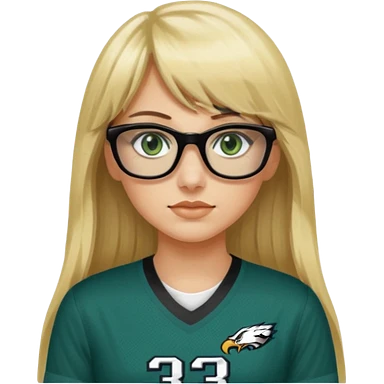 long blonde hair with bangs black rectangle glasses female green eyes football player wearing eagles jersey number 33 emoji | AI Emoji Generator