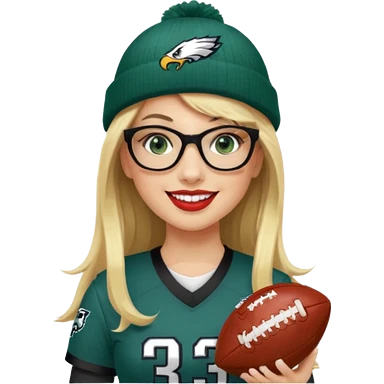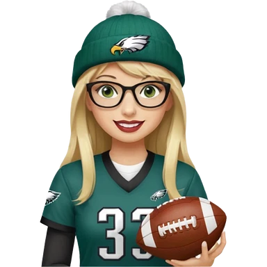 full length women wearing eagles uniform, long straight blonde hair, bangs, green eyes, black rectangle glasses, holding football, number 33, smiling, lipstick, eagles beanie emoji