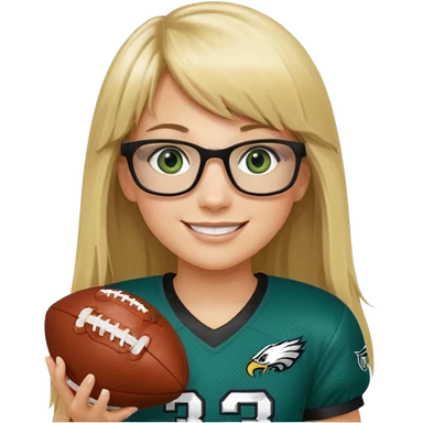 long blonde hair with bangs small black rectangle glasses female green eyes football player wearing eagles jersey number 33 holding football emoji