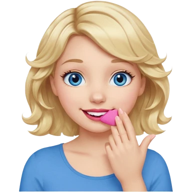 Girl Blonde short wavy hair, blue eyes, cute blue top, long lashes, pink lips, smiling, hand covering the mouth emoji