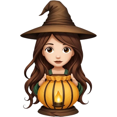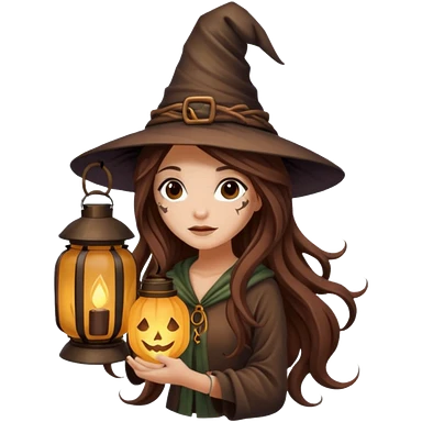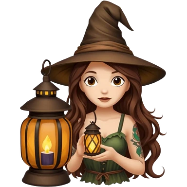 cute forest witch woman long wavy brown hair tattoos hiding inside lantern emoji