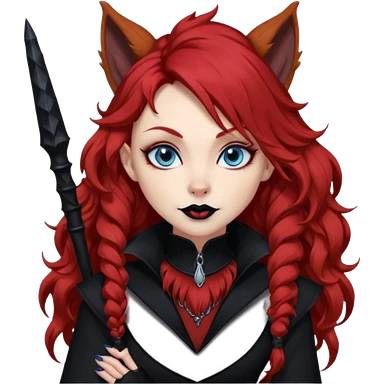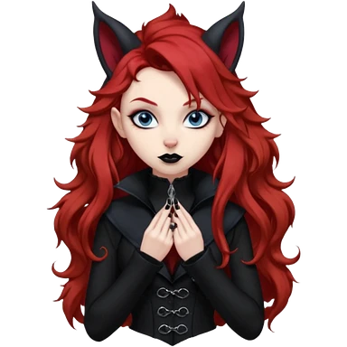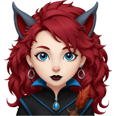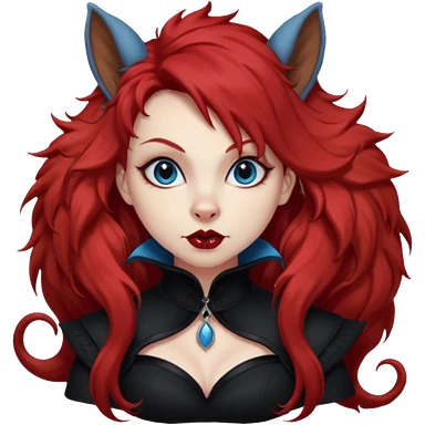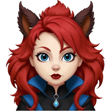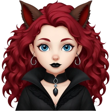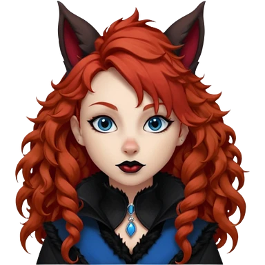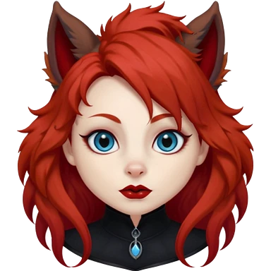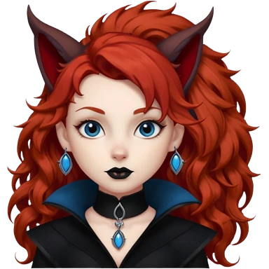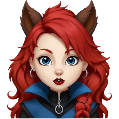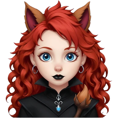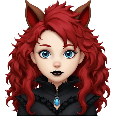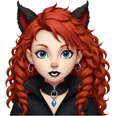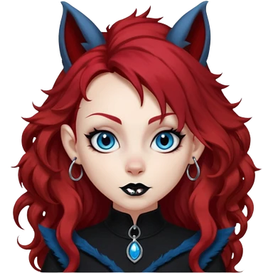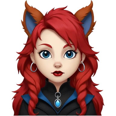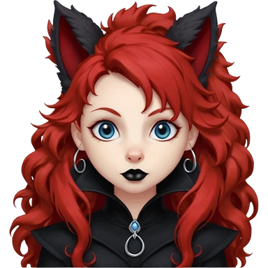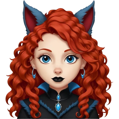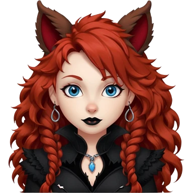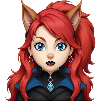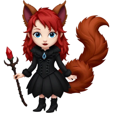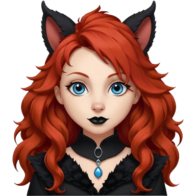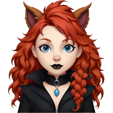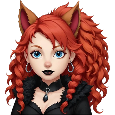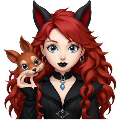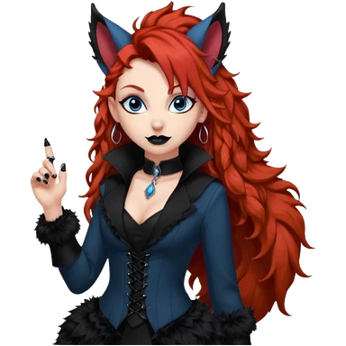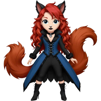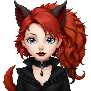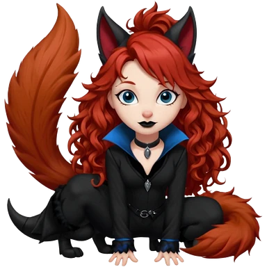 long curly red hair (darker), red pointed ears with black trim, black goth outfits, body and face human, blue eyes, more pointy chin, black lipstick, big fluffy red squirrel tail with black tips, like the attached photo with more outfits and poses, emoji