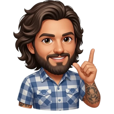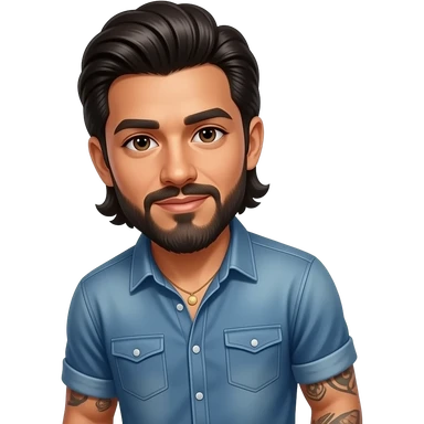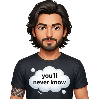 Kawaii style Handsome Latino, man with slicked back medium length hair and tattoos with a long beard with a text cloud saying you’ll never know emoji