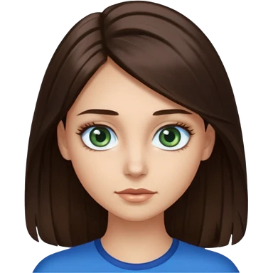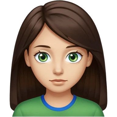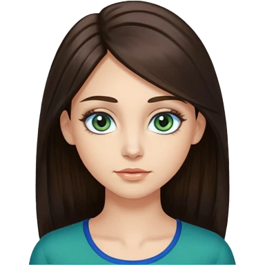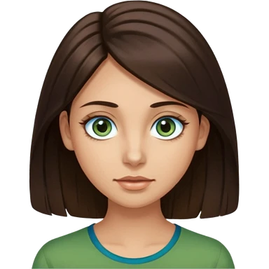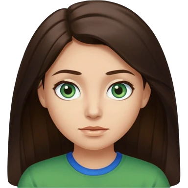 long dark brown hair with highlights in the front, big blue eyes clear skin with neck and green top on emoji