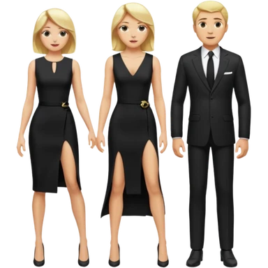 Blonde woman, black, Long, tight, sleveless Dress, Slot left Leg,man in suit, fly emoji
