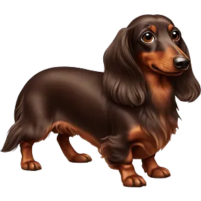 Long-haired dachshund with black-haired Asian girl wearing black dress emoji