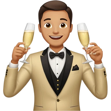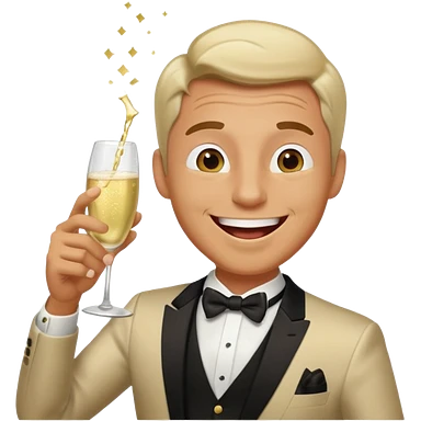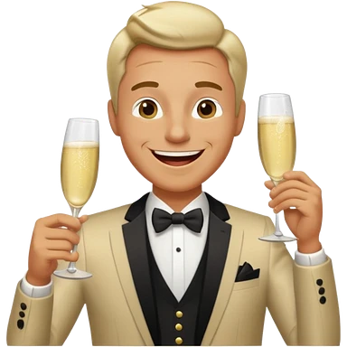 A happy man in party clothes laughs while drinking champagne straight from the glass. emoji