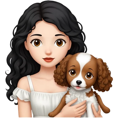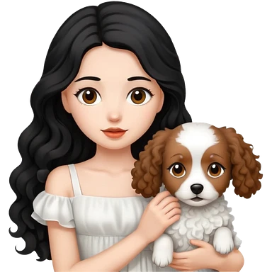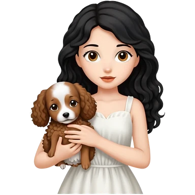 beautiful girl with long black hair in a white dress holding a small brown curly-haired dog emoji